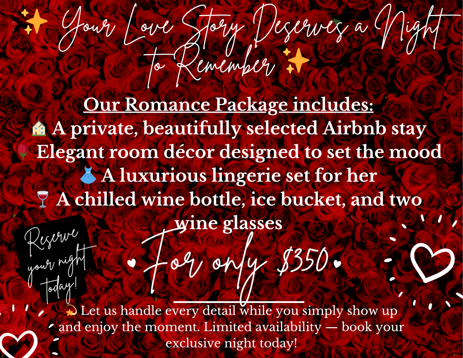 ✨PURCHASE YOUR ROMANCE PACKAGE TODAY✨ for $350 or Spend $150 or more and get entered into our Raffle for a chance to WIN A FREE ROMANCE NIGHT for two!